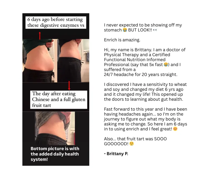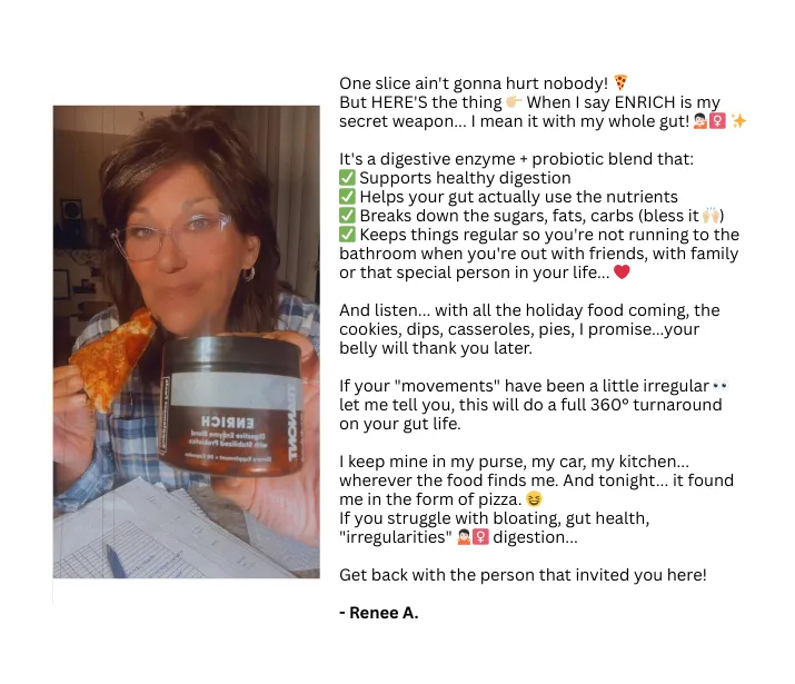 Kiss bloating, gas, and food fear goodbye. Enrich's 11 specialized enzymes tackle all five food groups while 1 billion CFUs of stabilized probiotics restore your gut's natural rhythm. Imagine actually enjoying restaurant meals again without mentally mapping every bathroom.